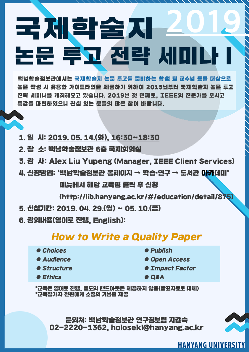 백남학술정보관에서는 국제학술지 논문 투고를 준비하는 학생 및 교수님 등을 대상으로「2019 국제학술지 논문 투고 전략 세미나 I」를 개최할 예정입니다. 관심 있는 분들께서 아래의 내용을 참조하시기 바랍니다.