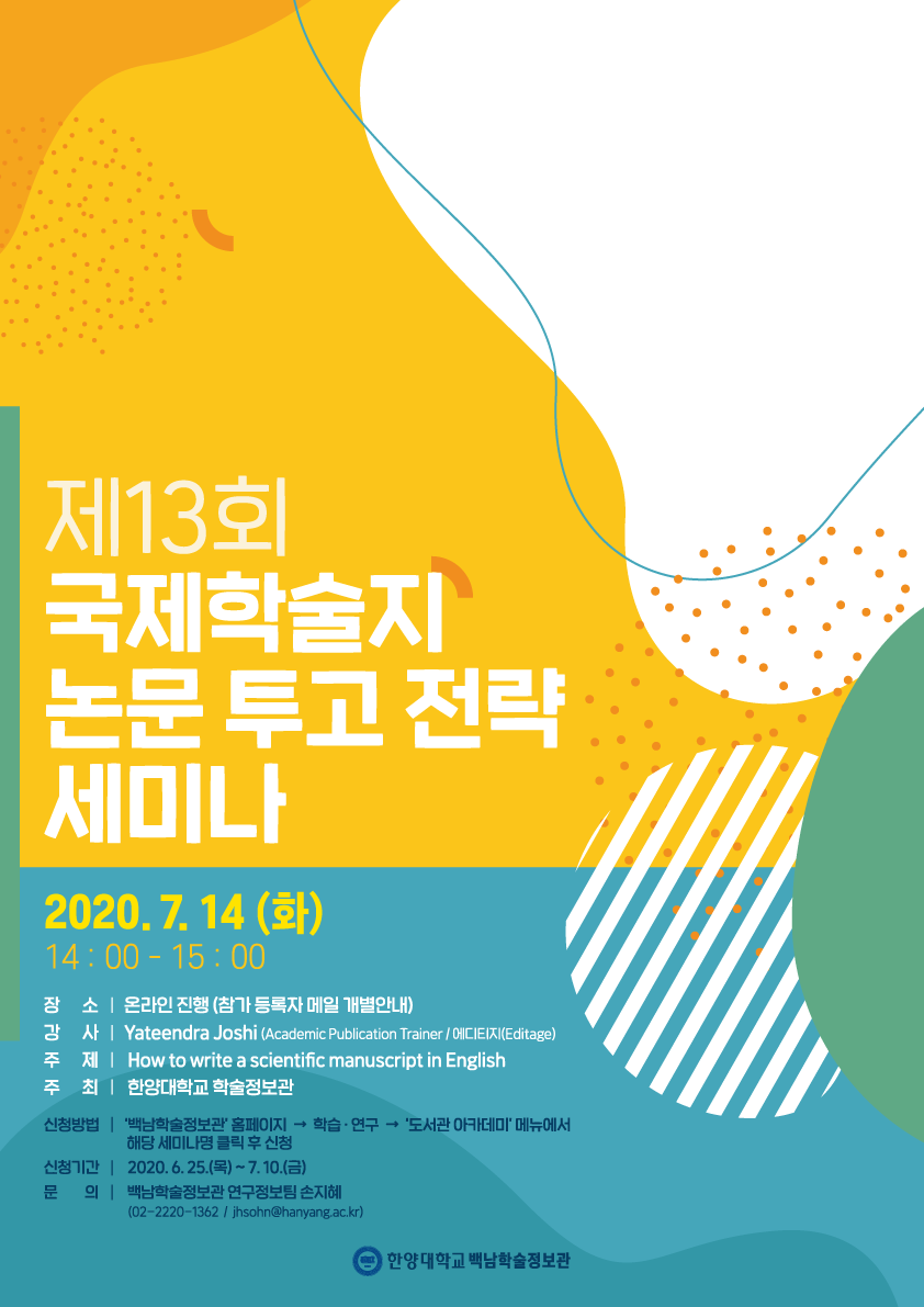 1. 세미나명 : 제13회 국제학술지 논문 투고 전략 세미나 (영어로 진행)